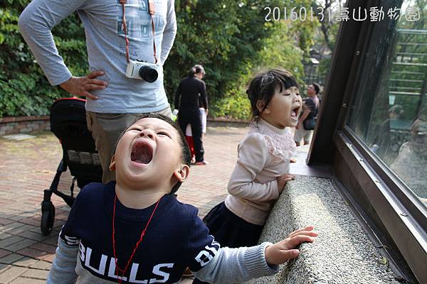 ↓接著到了老虎區,太矮看不到,大力士老爸就抱著他們爬上去看摟,我女兒我都快抱不動了!